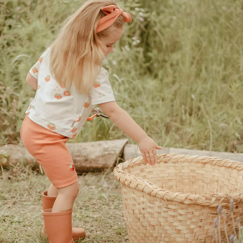 - Shorts canelado coral rosado com bordado de moranguinho, proporcionando o máximo de conforto e deixando o lookinho super descolado e fofinho.